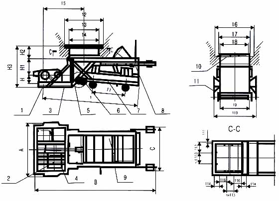標(biāo)注:1.減速機(jī) 2.電動(dòng)機(jī) 3.傳動(dòng)平臺(tái) 4.聯(lián)軸器 5.H形架 6.連桿 7.給煤槽 8.閘門 9.機(jī)架 10.漏斗 11.托輥