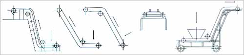 為獲得較好的受料和卸料條件,本機(jī)采用“Z”形布置形式。即設(shè)有上水平段、下水平段和傾斜段,并在下水平段受料,在上水平段卸料。上水平段與傾斜段之間采用凸弧形段機(jī)架連接,下水平段與傾斜段之間采用凹弧段機(jī)架相連以實(shí)現(xiàn)輸送帶的圓滑過(guò)渡。