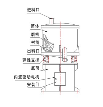 本機主要由底架支筒、磨筒、襯板、研磨介質(zhì)、激振器、支撐彈簧、驅(qū)動電機等部分組成。